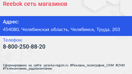 Reebok, сеть магазинов по адресу 454080, Челябинская область, Челябинск, Труда, 203 в дальнейшем Организация, размещена в следующих категориях: