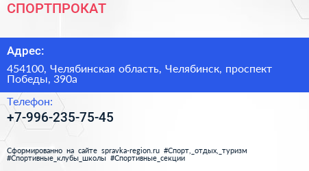 СПОРТПРОКАТ по адресу 454100, Челябинская область, Челябинск, проспект Победы, 390а в дальнейшем Организация, размещена в следующих категориях:
