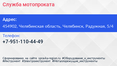 Служба мотопроката по адресу 454902, Челябинская область, Челябинск, Радужная, 5/4 в дальнейшем Организация, размещена в следующих категориях: