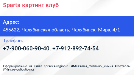 Sparta, картинг-клуб по адресу 456622, Челябинская область, Челябинск, Мира, 4/1 в дальнейшем Организация, размещена в следующих категориях: