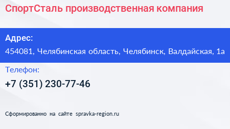 СпортСталь, производственная компания по адресу 454081, Челябинская область, Челябинск, Валдайская, 1а в дальнейшем Организация, размещена в следующих категориях: