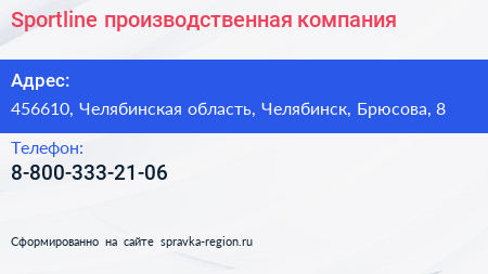 Sportline, производственная компания по адресу 456610, Челябинская область, Челябинск, Брюсова, 8 в дальнейшем Организация, размещена в следующих категориях:
