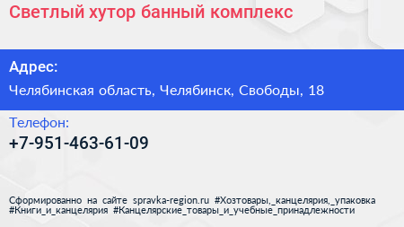 Светлый хутор, банный комплекс по адресу Челябинская область, Челябинск, Свободы, 18 в дальнейшем Организация, размещена в следующих категориях: