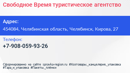 Свободное Время, туристическое агентство по адресу 454084, Челябинская область, Челябинск, Кирова, 27 в дальнейшем Организация, размещена в следующих категориях: