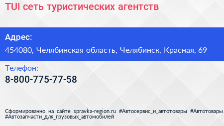 TUI, сеть туристических агентств по адресу 454080, Челябинская область, Челябинск, Красная, 69 в дальнейшем Организация, размещена в следующих категориях: