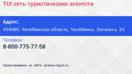 TUI, сеть туристических агентств по адресу 454080, Челябинская область, Челябинск, Энгельса, 24 в дальнейшем Организация, размещена в следующих категориях: