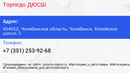 Торпедо, ДЮСШ по адресу 454012, Челябинская область, Челябинск, Копейское шоссе, 5 в дальнейшем Организация, размещена в следующих категориях: