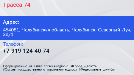 Трасса 74 по адресу 454081, Челябинская область, Челябинск, Северный Луч, 2д/1 в дальнейшем Организация, размещена в следующих категориях: