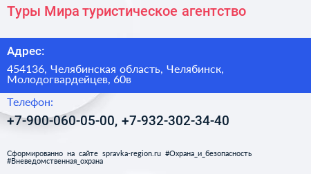 Туры Мира, туристическое агентство по адресу 454136, Челябинская область, Челябинск, Молодогвардейцев, 60в в дальнейшем Организация, размещена в следующих категориях: