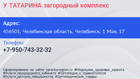 У ТАТАРИНА, загородный комплекс по адресу 456501, Челябинская область, Челябинск, 1 Мая, 17 в дальнейшем Организация, размещена в следующих категориях: