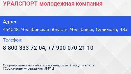 УРАЛСПОРТ, молодежная компания по адресу 454048, Челябинская область, Челябинск, Сулимова, 48а в дальнейшем Организация, размещена в следующих категориях: