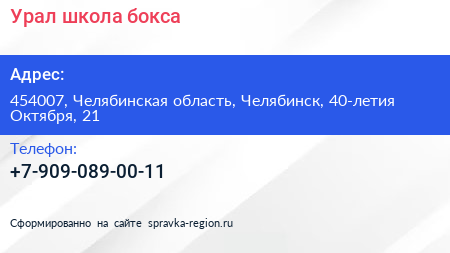 Урал, школа бокса по адресу 454007, Челябинская область, Челябинск, 40-летия Октября, 21 в дальнейшем Организация, размещена в следующих категориях:
