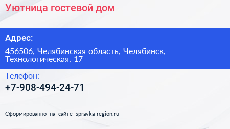 Уютница, гостевой дом по адресу 456506, Челябинская область, Челябинск, Технологическая, 17 в дальнейшем Организация, размещена в следующих категориях: