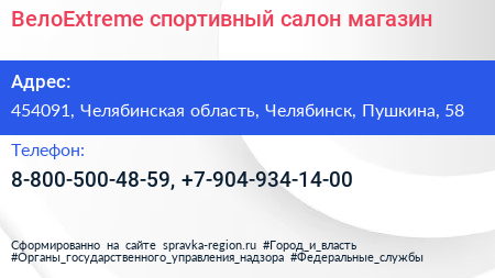 ВелоExtreme, спортивный салон-магазин по адресу 454091, Челябинская область, Челябинск, Пушкина, 58 в дальнейшем Организация, размещена в следующих категориях: