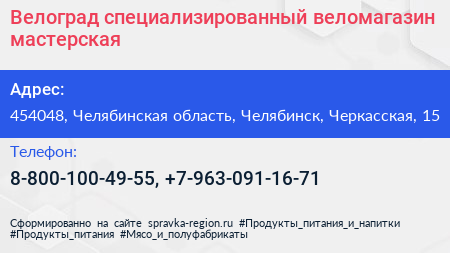 Велоград, специализированный веломагазин-мастерская по адресу 454048, Челябинская область, Челябинск, Черкасская, 15 в дальнейшем Организация, размещена в следующих категориях: