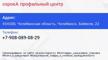 сорокА, профильный центр по адресу 454100, Челябинская область, Челябинск, Бейвеля, 22 в дальнейшем Организация, размещена в следующих категориях: