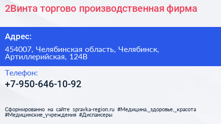 2Винта, торгово-производственная фирма по адресу 454007, Челябинская область, Челябинск, Артиллерийская, 124В в дальнейшем Организация, размещена в следующих категориях: