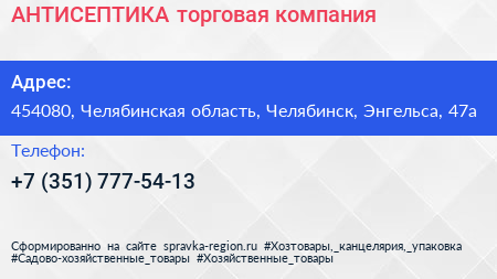 АНТИСЕПТИКА, торговая компания по адресу 454080, Челябинская область, Челябинск, Энгельса, 47а в дальнейшем Организация, размещена в следующих категориях:
