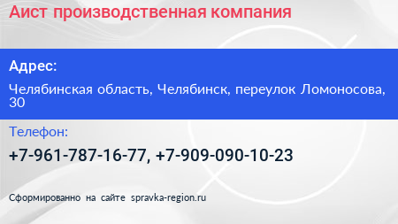 Аист, производственная компания по адресу Челябинская область, Челябинск, переулок Ломоносова, 30 в дальнейшем Организация, размещена в следующих категориях: