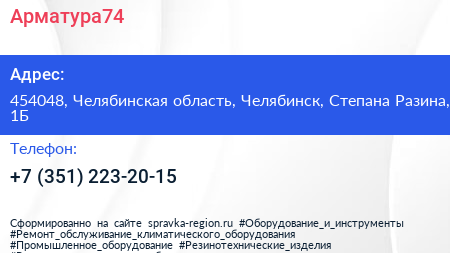 Арматура74 по адресу 454048, Челябинская область, Челябинск, Степана Разина, 1Б в дальнейшем Организация, размещена в следующих категориях: