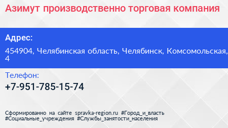 Азимут, производственно-торговая компания по адресу 454904, Челябинская область, Челябинск, Комсомольская, 4 в дальнейшем Организация, размещена в следующих категориях: