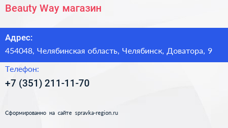 Beauty Way, магазин по адресу 454048, Челябинская область, Челябинск, Доватора, 9 в дальнейшем Организация, размещена в следующих категориях: