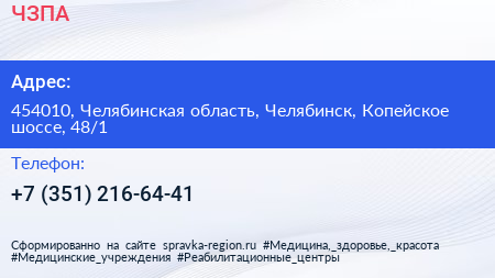 Для связи с организацией воспользуйтесь номером телефона: +7 (351) 216-64-41. Пн: c 08:00-17:00, Вт: c 08:00-17:00, Ср: c 08:00-17:00, Чт: c 08:00-17:00, Пт: c 08:00-17:00, Сб: выходной, Вс: выходной, вы можете обратиться в эту организацию.