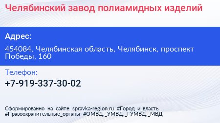 Челябинский завод полиамидных изделий по адресу 454084, Челябинская область, Челябинск, проспект Победы, 160 в дальнейшем Организация, размещена в следующих категориях: