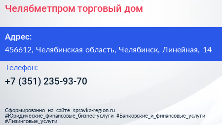 Челябметпром, торговый дом по адресу 456612, Челябинская область, Челябинск, Линейная, 14 в дальнейшем Организация, размещена в следующих категориях: