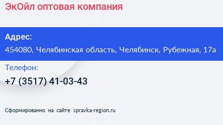 ЭкОйл, оптовая компания по адресу 454080, Челябинская область, Челябинск, Рубежная, 17а в дальнейшем Организация, размещена в следующих категориях: