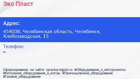 Эко-Пласт по адресу 454038, Челябинская область, Челябинск, Хлебозаводская, 15 в дальнейшем Организация, размещена в следующих категориях: