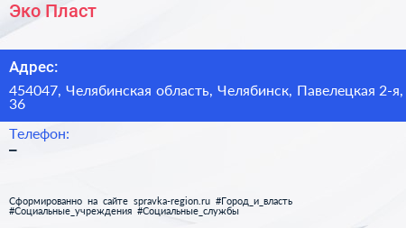 Эко-Пласт по адресу 454047, Челябинская область, Челябинск, Павелецкая 2-я, 36 в дальнейшем Организация, размещена в следующих категориях: