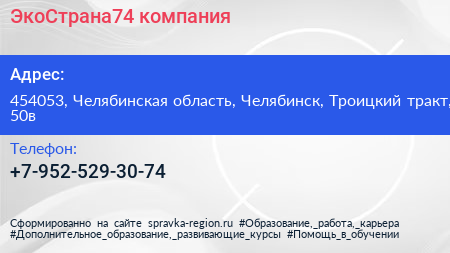 ЭкоСтрана74, компания по адресу 454053, Челябинская область, Челябинск, Троицкий тракт, 50в в дальнейшем Организация, размещена в следующих категориях: