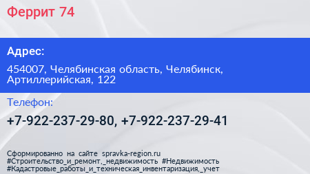 Феррит 74 по адресу 454007, Челябинская область, Челябинск, Артиллерийская, 122 в дальнейшем Организация, размещена в следующих категориях: