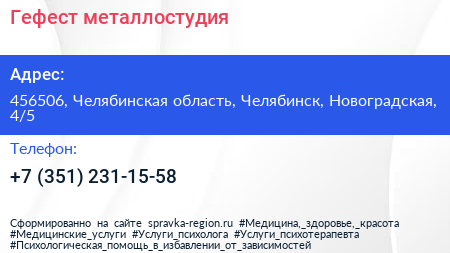 Гефест, металлостудия по адресу 456506, Челябинская область, Челябинск, Новоградская, 4/5 в дальнейшем Организация, размещена в следующих категориях: