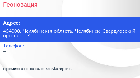 Геоновация по адресу 454008, Челябинская область, Челябинск, Свердловский проспект, 7 в дальнейшем Организация, размещена в следующих категориях: