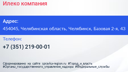 Илеко, компания по адресу 454045, Челябинская область, Челябинск, Базовая 2-я, 43 в дальнейшем Организация, размещена в следующих категориях: