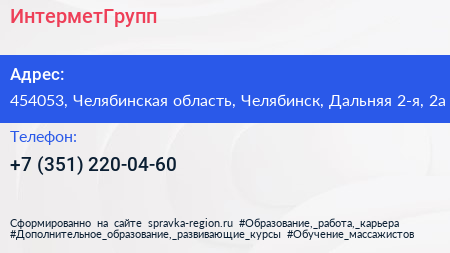 ИнтерметГрупп по адресу 454053, Челябинская область, Челябинск, Дальняя 2-я, 2а в дальнейшем Организация, размещена в следующих категориях: