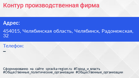 Контур, производственная фирма по адресу 454015, Челябинская область, Челябинск, Радонежская, 32 в дальнейшем Организация, размещена в следующих категориях: