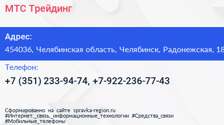 МТС Трейдинг по адресу 454036, Челябинская область, Челябинск, Радонежская, 18 в дальнейшем Организация, размещена в следующих категориях: