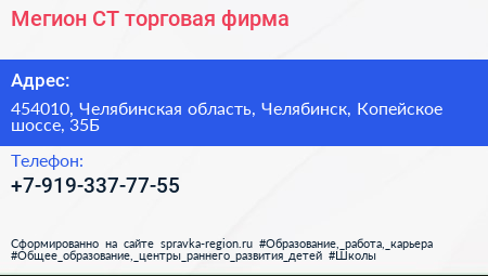 Мегион СТ, торговая фирма по адресу 454010, Челябинская область, Челябинск, Копейское шоссе, 35Б в дальнейшем Организация, размещена в следующих категориях: