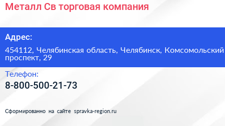 Металл Св, торговая компания по адресу 454112, Челябинская область, Челябинск, Комсомольский проспект, 29 в дальнейшем Организация, размещена в следующих категориях: