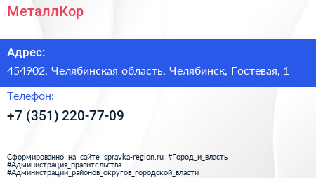 МеталлКор по адресу 454902, Челябинская область, Челябинск, Гостевая, 1 в дальнейшем Организация, размещена в следующих категориях:
