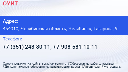 ОУИТ по адресу 454010, Челябинская область, Челябинск, Гагарина, 9 в дальнейшем Организация, размещена в следующих категориях: