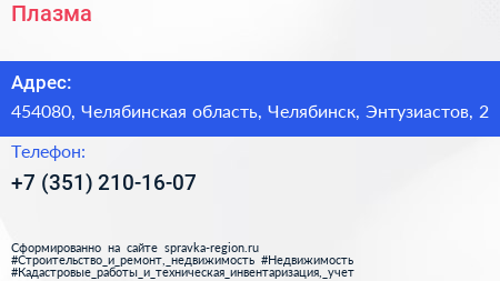 Плазма по адресу 454080, Челябинская область, Челябинск, Энтузиастов, 2 в дальнейшем Организация, размещена в следующих категориях: