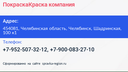 ПокраскаКраска, компания по адресу 454081, Челябинская область, Челябинск, Шадринская, 100 к1 в дальнейшем Организация, размещена в следующих категориях: