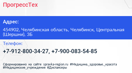 ПрогрессТех по адресу 454902, Челябинская область, Челябинск, Центральная (Шершни), 3Б в дальнейшем Организация, размещена в следующих категориях: