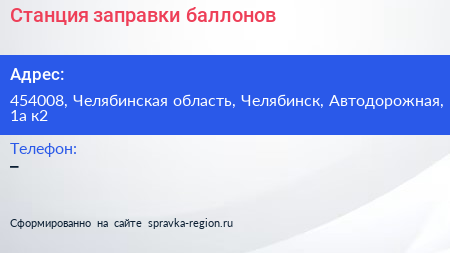 Станция заправки баллонов по адресу 454008, Челябинская область, Челябинск, Автодорожная, 1а к2 в дальнейшем Организация, размещена в следующих категориях: