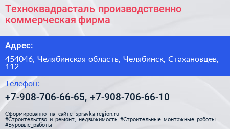 Техноквадрасталь, производственно-коммерческая фирма по адресу 454046, Челябинская область, Челябинск, Стахановцев, 112 в дальнейшем Организация, размещена в следующих категориях: