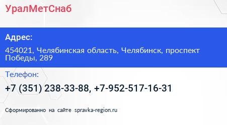 УралМетСнаб по адресу 454021, Челябинская область, Челябинск, проспект Победы, 289 в дальнейшем Организация, размещена в следующих категориях: